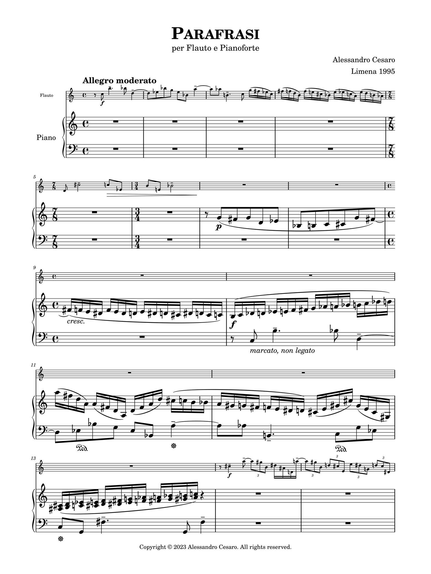 Parafrasi (1995) is a diptych as other compositions of the same period. In this particular case the dualism is also a matter of instruments. The title originated from the double idea to paraphrase different styles and to rework some of my old compositions in order to bring them to a new perspective.
